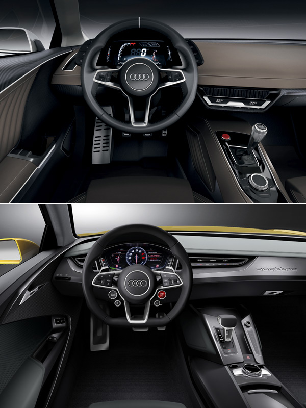 內裝設計方面,Sport quattro(下)呈現完全不同於quattro概念車的佈局,而因應動力傳動系統的變更,Sport quattro概念車也改採附方向盤換檔撥片的八速tiptronic變速系統。