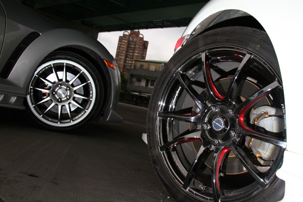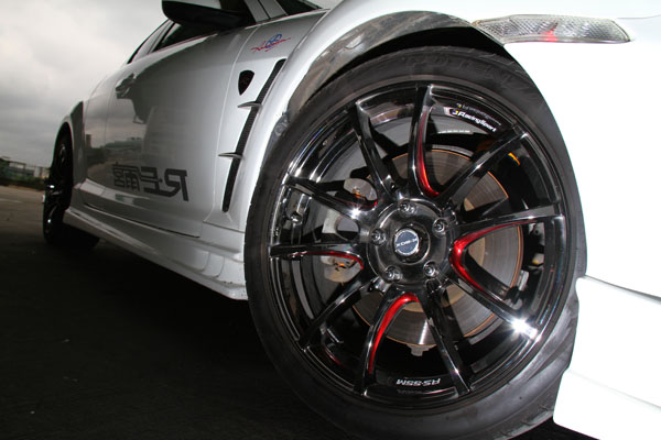 雙色設計的輪圈,搭配RE雨宮側裙,讓車側的視覺效果更為豐富。