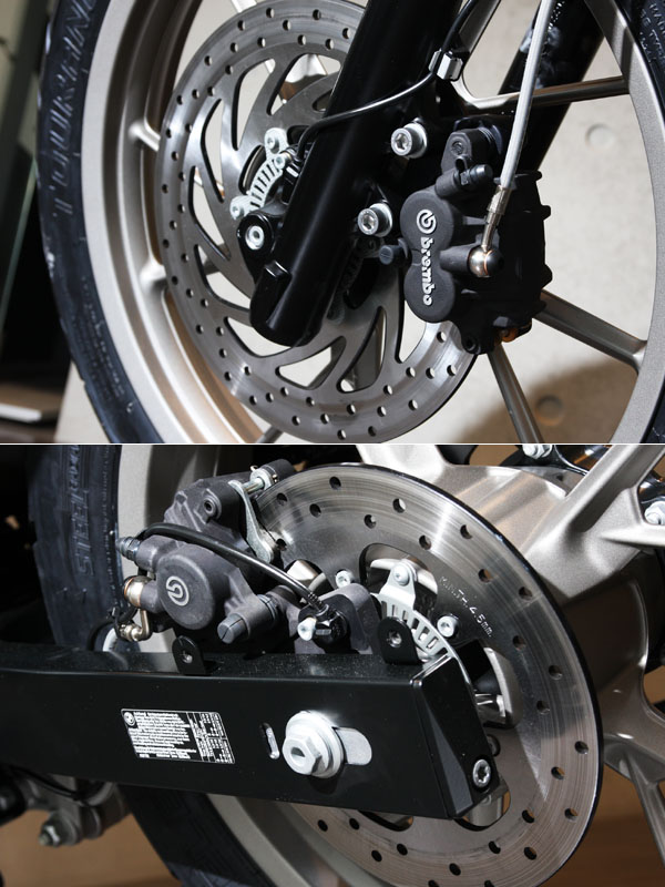 煞車系統為前雙320mm碟盤搭配四活塞卡鉗、後320mm碟盤搭配雙活塞卡鉗。