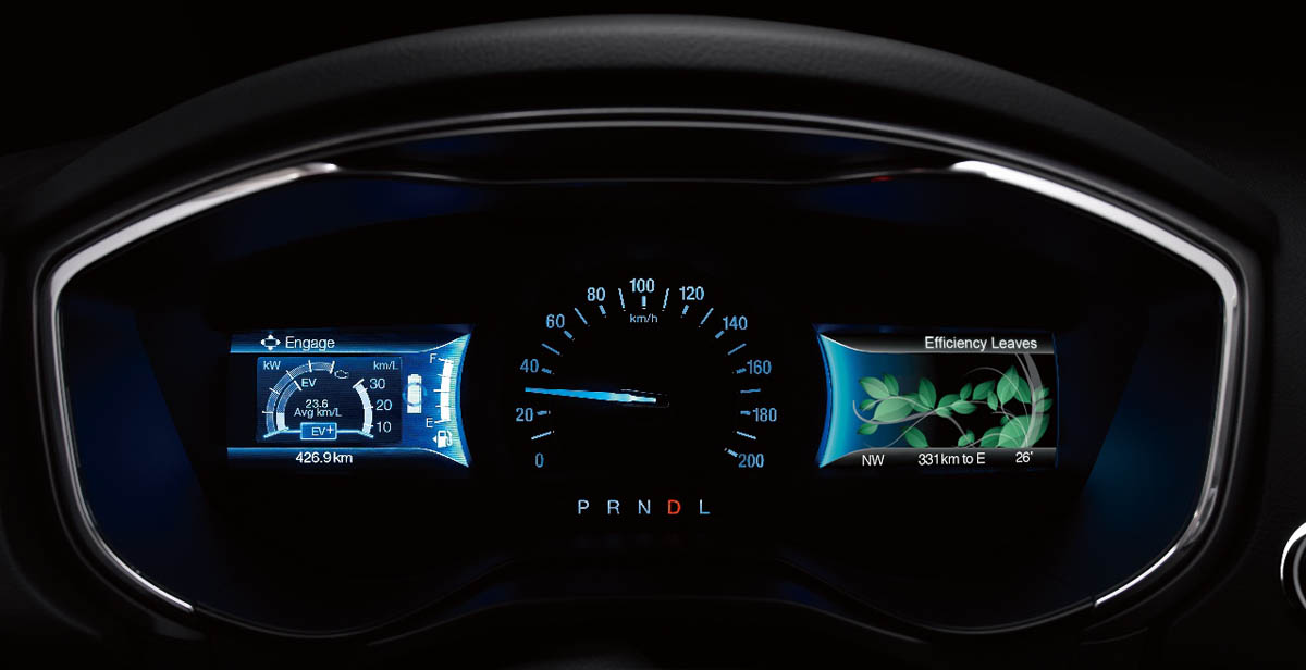 福特專利的SmartGauge® with EcoGuide智慧節能輔助多工儀錶板,將可使駕駛精準監控車輛動能分配,提升行車節能表現,達成Ford Mondeo Hybrid整體動力效能提升。智慧節能輔助多工儀錶板提供駕駛者與Ford Mondeo Hybrid的互動體驗,獨特設計的系統能有效輔助駕駛改良操駕習慣,大幅度提升整體油耗表現。左右雙全彩液晶螢幕可顯示包含電池電量、平均油耗和即時油耗等訊息,駕駛亦能透過方向盤上的按鈕滾動主選單,選擇最符合需求的資訊顯示,以其中六大資訊項目為例: