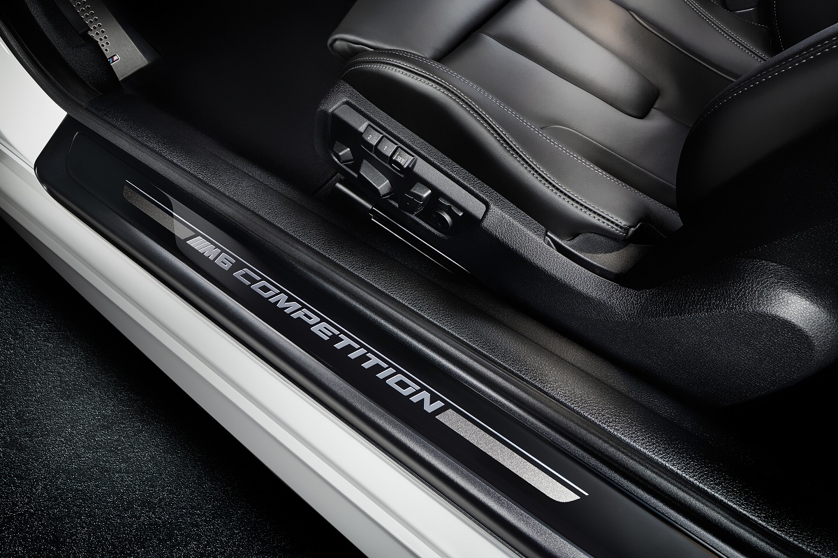 內裝皮革部分,搭配碳纖維及消光黑的質感,均為專屬的Merino黑色皮革與對比車縫線的配色,如外觀選白色即為白色車縫線;黃色外觀則為黃色縫線。而其他內裝特色尚有專屬碳纖維/麂皮賽車方向盤、碳纖維內飾板以及M6 Competition字樣門檻飾條。