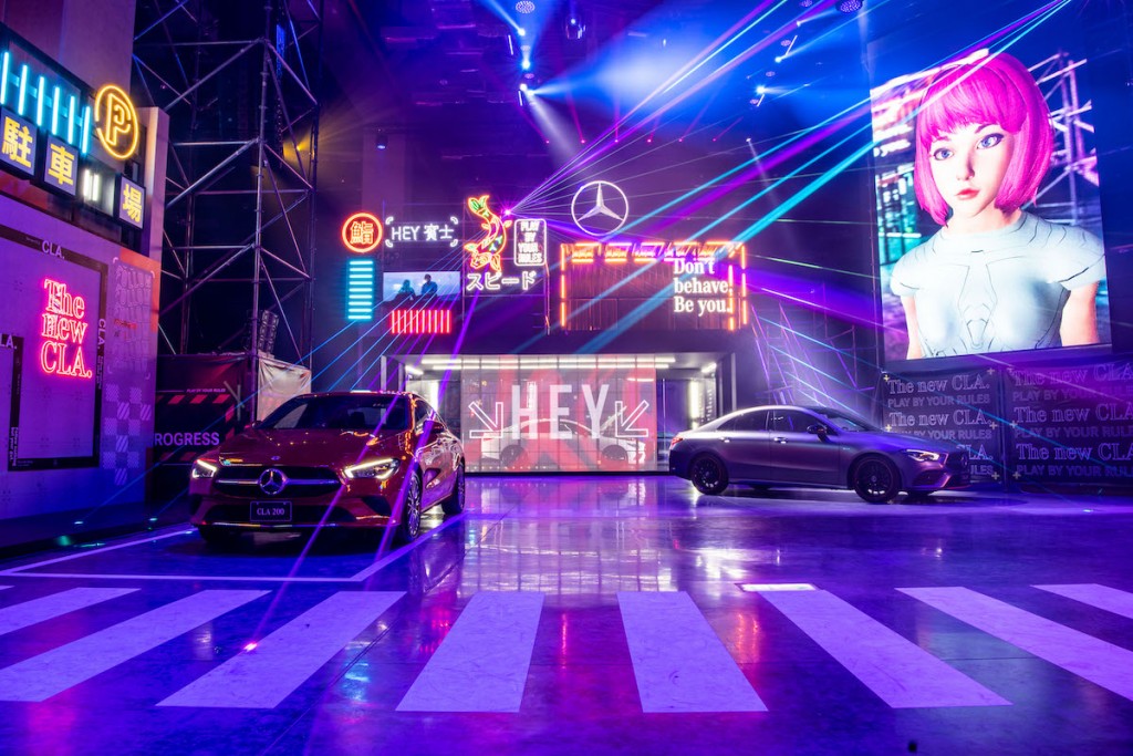 發表會現場,竟然只是一個修車廠?! 警示線纏繞著入口加上嚴密的保全,仿佛重大事件在裡面發生,這竟是台灣賓士所設下的入口結界,等到一切就緒,與會貴賓們準備登入 CLA 的異度空間,這是一個以 1:1 打造的真實街景:各式各樣的霓虹廣告看板、停車場、小酒吧、遊戲間及潮流服飾店,甚至是多樣化的街頭小吃攤販,唯一不同的是,這是一個由 A.I. 人工智慧主宰的城市,利用動態補捉技術,將主持人虛擬化投影在 LED 螢幕上,猶如一個生動的人形廣告看板,這位虛擬主持人大有來頭,是由 Mercedes-Benz 進階多媒體系統 MBUX 所扮演,她有條不紊的引導大家使用手上的代幣兌換飲料及食物,甚至可以投販賣機、遊戲機。時間一到,遊戲主機正式啟動,化身為城市主人的台灣賓士總裁高明漢先生 Michael Grewe 透過 LED 投射影像,歡迎所有玩家登入遊戲並介紹今天的主角 The new CLA 200 率先出場,全新的超殺物種正式亮相。