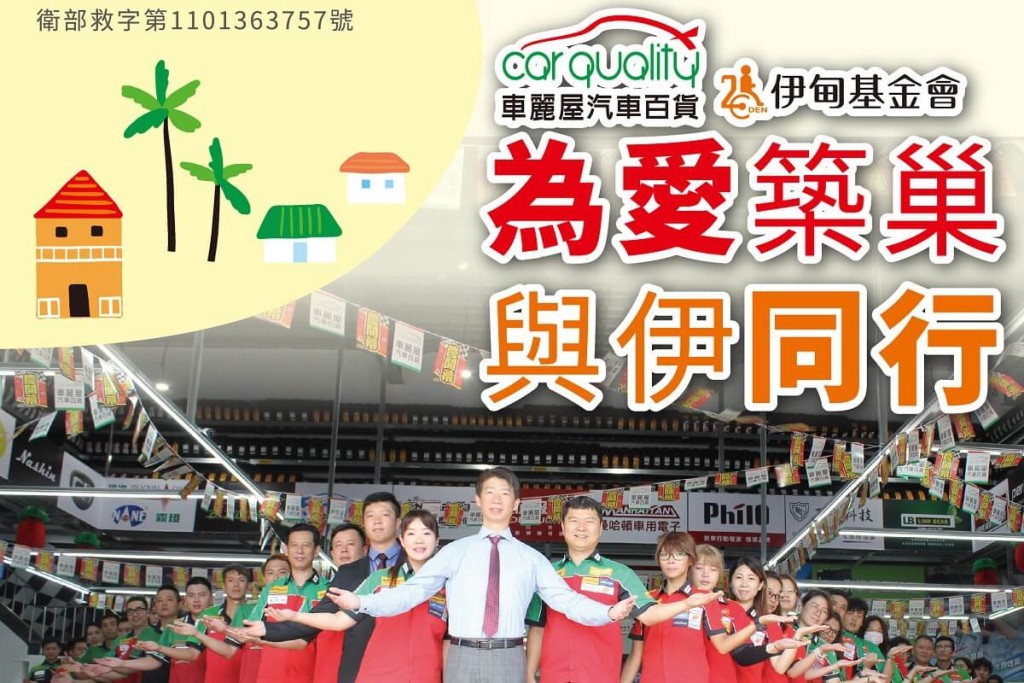 用我們的專業,讓安心安全成為愛心的支柱,支持公益不間斷,車麗屋汽車百貨與伊甸社會福利基金會共同呼籲,期盼您您踴躍投入,也希望您在參與公益活動時,也能感受到車麗屋全體同仁的愛心與關心,再次邀請您參與「為愛築巢 與伊同行」活動,也歡迎您至全台車麗屋門市消費外,也能響應零錢捐、發票捐活動,讓我們集結眾人的力量,成為公益團體邁向未來的動力。活動詳情請洽伊甸社會福利基金會(02)2230-7715分機5318。