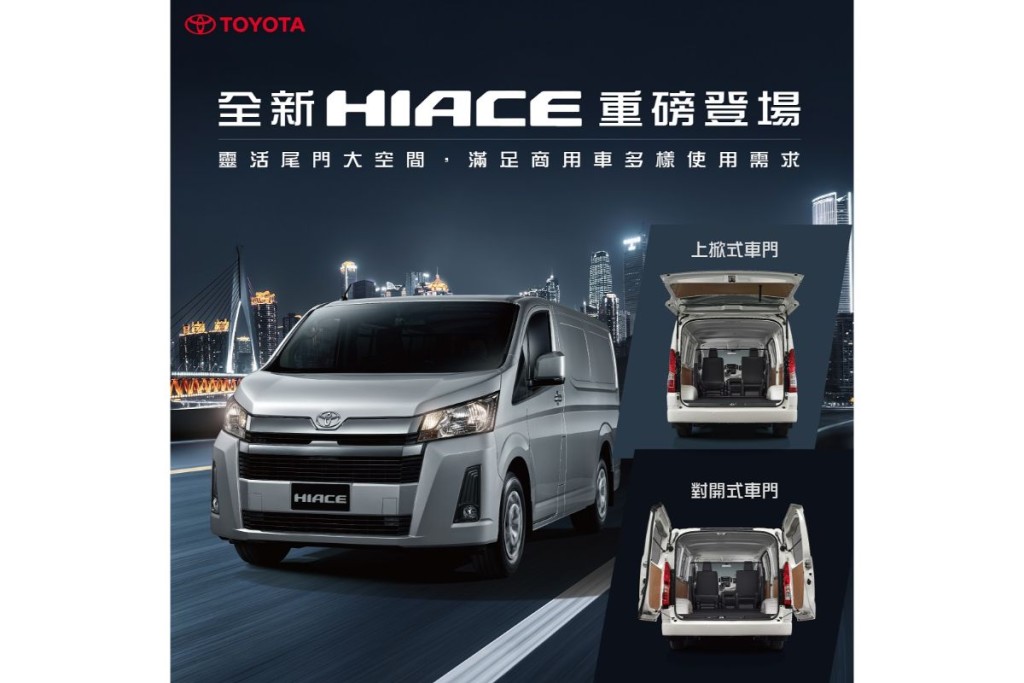 除熱銷的上掀式尾門車型外,今年10月特別引進對開式尾門車型,讓HIACE車型選擇更完備,不論是物流載貨或精緻運送,全新HIACE將是您打拼事業的好夥伴。即日起於和泰汽車商用車經銷商/長源汽車、蘭揚汽車、東部汽車營業據點正式銷售。購車請洽全台營業據點,亦可至TOYOTA商旅車官網(www.toyota-granvia.com.tw)查詢,或致電和泰汽車顧客專線0800-522567洽詢。