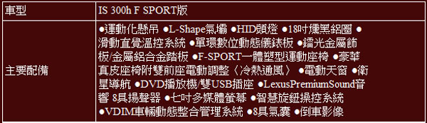 新一代IS以駕馭樂趣的理念出發,重新打造性能房車新規格,除汽油版的IS 250之外更導入了搭載獨步全球Hybrid油電複合動力科技的IS 300h, 使得Lexus Hybrid 車款全員到齊。