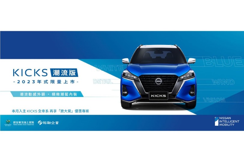 NISSAN KICKS去年10月全新改款上市以來,主打「外型、安全、便利、動力」四大升級訴求,至今年1月底累計銷售已達4,634台,穩坐小型跨界休旅冠軍(註1)。為感謝消費者的熱愛與肯定,並滿足車主追求與眾不同的個性化需求,NISSAN運用2023年式限量推出300台的「KICKS潮流版」,搭配專屬全新車色白頂狂藍,升級潮流動感外觀,包含動感擾流尾翼(註2)、酷黑17吋鋁圈及酷黑車頂架;配備精緻潮藍內裝,包含潮藍D-Shape方向盤、潮藍3D紓壓皮椅、潮藍絨毛腳踏墊及精裝壓印頭枕,外觀及內裝極具視覺特色,並標配豐富的智行安全配備,超值汰舊換新價格81.5萬元起(註3),配備升級不加價,給消費者最超值的享受。