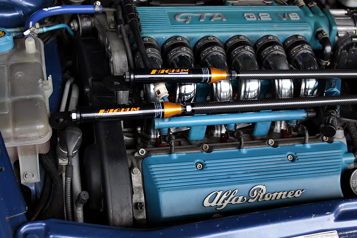 當車頂起時,望者緊緊相連的工藝作品,果然與國產、日系車別有一番風趣。因為「HIGHLINE車身動態平衡制震桿」採取直上加裝為主,侵入性鑽孔焊接的安裝方式比較不能讓車主們接受,因此看到156GTA底盤時,還真頗有難度。 (其實鑽孔及焊接方式,效果最好)