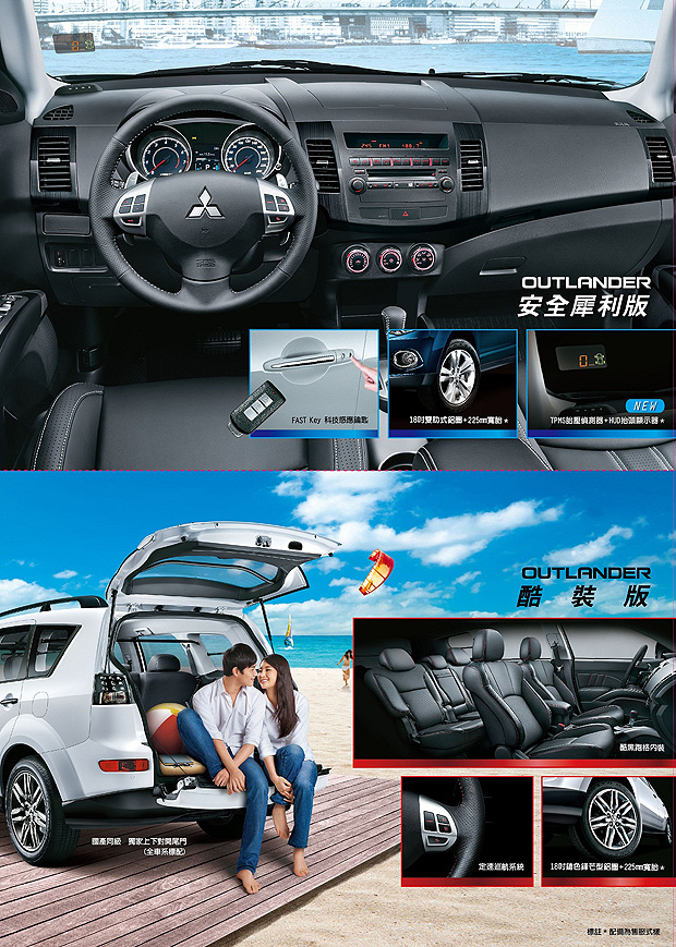 以「用最愛照顧最愛」為品牌主張的都會SUV Outlander,為滿足車主對家庭安全及空間配備的要求,以加配備不加價的方式推出高CP值的特仕車款,繼深受消費者喜愛的酷裝版特仕車後,為再提升車輛安全性能,Mitsubishi再推出Outlander安全犀利版特仕車,新增18吋雙肋式鋁圈、225mm寬胎、TPMS胎壓偵測器及HUD抬頭顯示器等多項安全配備,貼心照護車主行的安全。此外,酷裝版特仕車也同步熱銷,雙車型優惠,81.9萬起豪華登場!