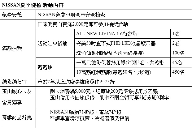 裕隆日產表示,Nissan「豔陽夏」夏季健檢活動,除了持續提供空調冷卻系統保養優惠、輪胎電瓶超殺價及車齡滿七年以上車輛進廠即享維修零件75折起的感心服務外,本次更回饋Nissan車主,只要在活動期間回廠消費自費滿2,000元即可參加最大獎為All New Livina汽車乙台的抽獎活動,還有週週抽萬元禮券及紅利點數等多項超值大獎,要讓所有回廠Nissan車主享有最安全的行車品質,歡樂度過整個夏天。