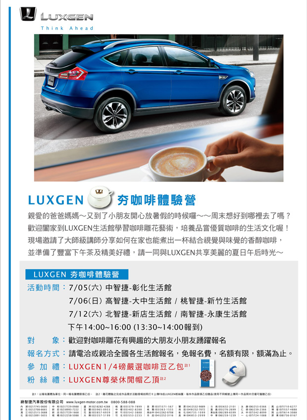 除了提供消費者各車系超值優惠方案外,面對暑假的來臨,Luxgen於本月份推出「夯咖啡藝術雕花體驗營」,提供全家人闔家周末出遊的好去處;Luxgen服務廠於6月份針對回廠車主所推出的花式咖啡深受喜愛,特別推出品嘗優質咖啡生活文化的「Luxgen夯咖啡藝術雕花體驗營」活動,現場將邀請大師級講師一同分享,如何在家也能煮出一杯結合視覺與味覺的香醇咖啡,並準備了豐富下午茶及精美好禮,歡迎闔家到Luxgen生活館學習咖啡雕花藝術,共享優閒美好的夏日午后時光!相關活動訊息請上官網:http://www.Luxgen-motor.com.tw/content/web/tc/activity.html。