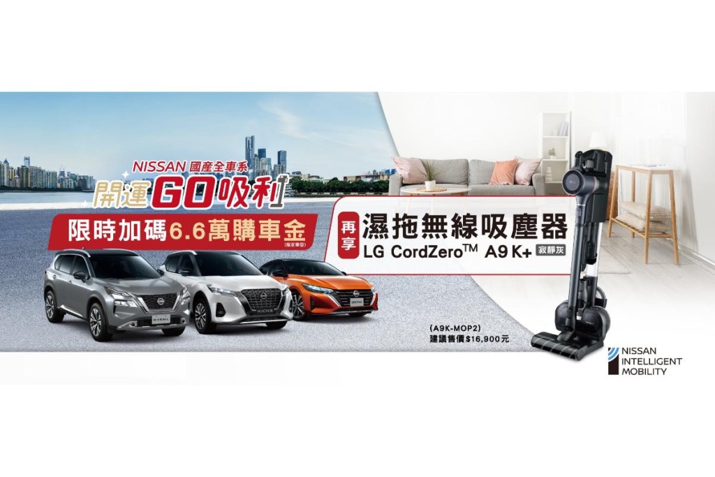 為讓車主於歲末享受無塵吸利美好生活,NISSAN精心嚴選購車好禮,凡於本月入主NISSAN指定車型,即可獲得LG CordZero™ A9 K+ 系列濕拖無線吸塵器。LG CordZero™ A9 K+ 系列濕拖無線吸塵器(型號A9K-MOP2)結合創新科技,為消費者帶來卓越的清潔體驗,配備強勁的220W吸力與智慧雙旋濕拖吸頭,實現邊吸邊拖的高效清潔效果,並適用多種地板材質。透過LG ThinQ APP,使用者可輕鬆掌握電量與清潔日誌,讓日常清潔更加智慧化。多款吸頭組合可輕鬆處理家用、車用與床鋪清潔需求,帶來方便且徹底的無塵吸利體驗。