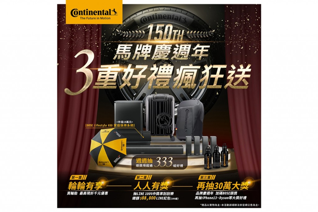 感謝各位車主長年以來的支持,馬牌特別獻上三重好禮瘋狂送活動,敬邀大家一同歡慶。第一重『輪輪有享,單次購買四條馬牌輪胎,即可享有最高現折1,000元的優惠』,第二重『人人有獎,於德國馬牌輪胎LINE官方帳號完成登錄,將可獲得100%中獎的LINE電子刮刮卡乙張』,第三重再『抽30萬大獎』,獎項包含最大獎市值19萬的BOSE家庭娛樂系統Lifestyle 650,熱門的iPhone 13、Dyson全新輕量吸塵器、adidas ULTRABOOST跑鞋等好禮,總獎金超過新台幣30萬!