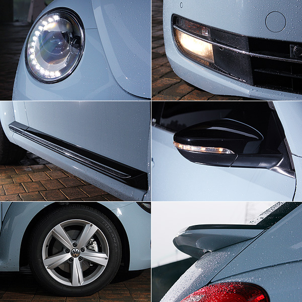 為了與更為有勁的動力輸出搭配,Beetle 1.4 Sport也從外觀與內裝等方面透過細節的點綴,加重其運動化的元素。不僅腳上換穿尺寸215/55 R17的輪胎,並且改搭5輻狀的輪圈,搭配臀部上揚的尾翼、黑色後視鏡外蓋、側裙飾條與鯊魚鰭天線,以及嵌入LED晝形燈與小燈眉的圓滾大眼。除此之外,新一代Beetle更為厚實、低扁的車身線條,都加重了其運動化氣息。