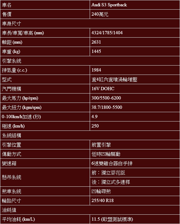從數據面討論,S3 Sportback的動力滿輸出與性能數據,或許都非現今性能掀背產品之最,為了在熱血以及舒適中取得平衡的調校設定,所能換得的操控反應與圈速表現可能也不是最突出的一款。然而,就如同文前所言,S3 Sportback在我心中,就如同一款依循中庸之道而生的性能掀背產品,各方兼顧而無過與不及,既能滿足熱血車迷心中的悸動,也能符合豪華品牌應有的舒適與質感期待,即使不是性能之最也非奢華之顛,如此便以足夠。