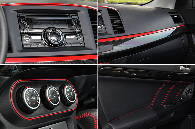 車內的營造,呼應外觀上的運動化氣息。黑色的內裝基底,搭配上紅色的儀表版飾條與方向盤、座椅、排檔頭的皮革縫線,以及橫亙整個儀表版總承與車門的碳纖維飾板,再加上增強腿部與腰部包覆性的運動化座椅,Lancer iO確實讓車內的熱血氣息再向上加分。不僅如此,眼前的方向盤不僅使用透氣皮革搭配紅色縫線,並綴以碳纖維飾板且繡上iO的徽飾,後方還配有鋁合金材質的換檔撥片,著實讓人感受到Mitsubishi對於Lancer iO細節上的用心。