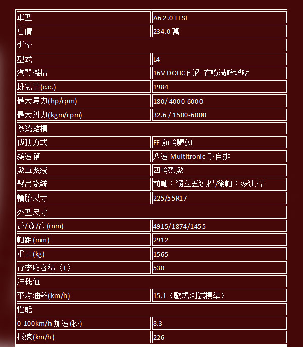 本次試駕的A6 2.0 TFSI搭載了泛用於VW集團各品牌車款的2.0升缸內直噴渦輪增壓引擎,可輸出180hp最大馬力與32.6kgm最大扭力,搭配採CVT設計的multitronic變速系統,並具備八個檔位設定,可提供更好的節能表現。