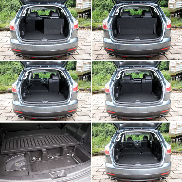 CX-9超過5m的車長,搭配上2875mm的軸距,在採三排七人座的設定下,具備了相當優渥的縱向乘坐空間,也許是被它緊致的外表所影響,一開始並不看好它的乘坐空間表現,由其是在的三排座位的部分,過去同樣有採三排座位設定的該級距對手,大多僅是應付短程運載為主,但是在CX-9上,卻可以提供一名身高170cm的成人乘坐,讓人留下深刻印象,而且第二排座位還具備前後13公分的滑移調整功能,可為後兩排空間做更彈性的運用;不過在頭部空間部分,第三排座位受到車頂下切設計影響,壓迫感較重,而且離尾門的距離也較近,安全感也受到影響。至於在行李廂空間部分,則是可在配合椅背放導機制,於487L~1345L間做變化。