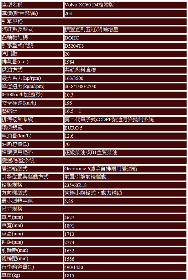 Volvo XC60 D4旗艦版基本規格