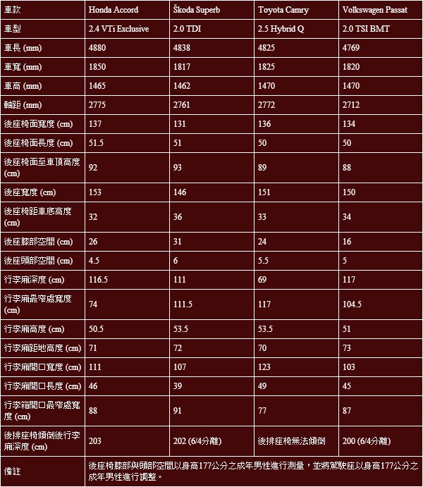 Toyota Camry Hybrid雖然是當中唯一的國產房車,然而在產品實力與價格上,卻擁有與進口同級車款一較高下的競爭力。在過去Accord仍以國產方式在臺灣販售時,更是直接的對手,為此Camry Hybrid也進入這次的集評名單之中。車長4825mm、車寬1825mm、車高1470mm的Camry尺碼接近於Superb,然而2772mm的軸距卻僅次於Accord,為4款房車中次高的一款。轉化成後座空間的尺碼,Camry Hybrid能夠提供136公分寬、50公分長的後座椅面,後座椅面距車底與車頂的距離則分別為33公分與89公分,後座寬度為151公分,單就後座空間與坐椅的測量而言,並不十分突出。但,Camry Hybrid採用了平整化的後座地板設計,為其後座空間表現加了些許分數。