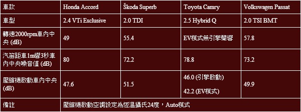 論靜肅性的噪音測量,受惠於Hybrid混合動力系統,在模擬市區道路的2000rpm轉速測試,Camry Hybrid並無引擎運轉聲響的傳出。在怠速測試中,將空調系統開啟,車室仍然可以測得42.2dB的分貝值,刻意啟動引擎也能測得46.0dB的分貝值,仍舊是各款車中表現最佳的一款。然而,在模擬環境噪音的汽笛鳴響測試中,Camry Hybrid卻繳出的78.8dB的數值,僅優於Accord,顯見這次測試的兩款日系中大型房車在隔音設計的思維上,皆是以阻絕引擎室或是路面噪音為優先。