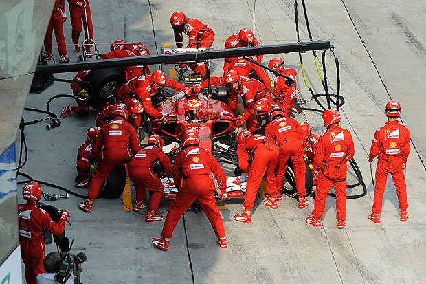 因為擦撞而爆胎的Kimi Raikkonen回到Pit Lane更換輪胎後已落居所有場上車手的末位。
