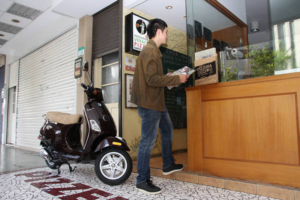 蜜糖棕色的VESPA LX150,恰巧與地面上的PIZZERIA OGGI店名拼磚為同色調。