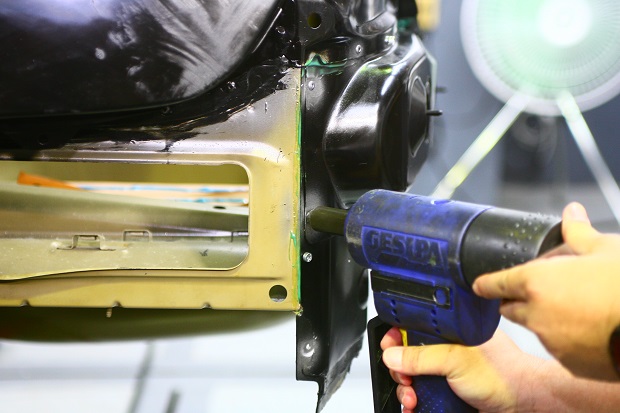 輕量化的鋁合金車身萬一毀損,更換是確保安全唯一的維修辦法(圖為更換鋁材後的點悍作業)。